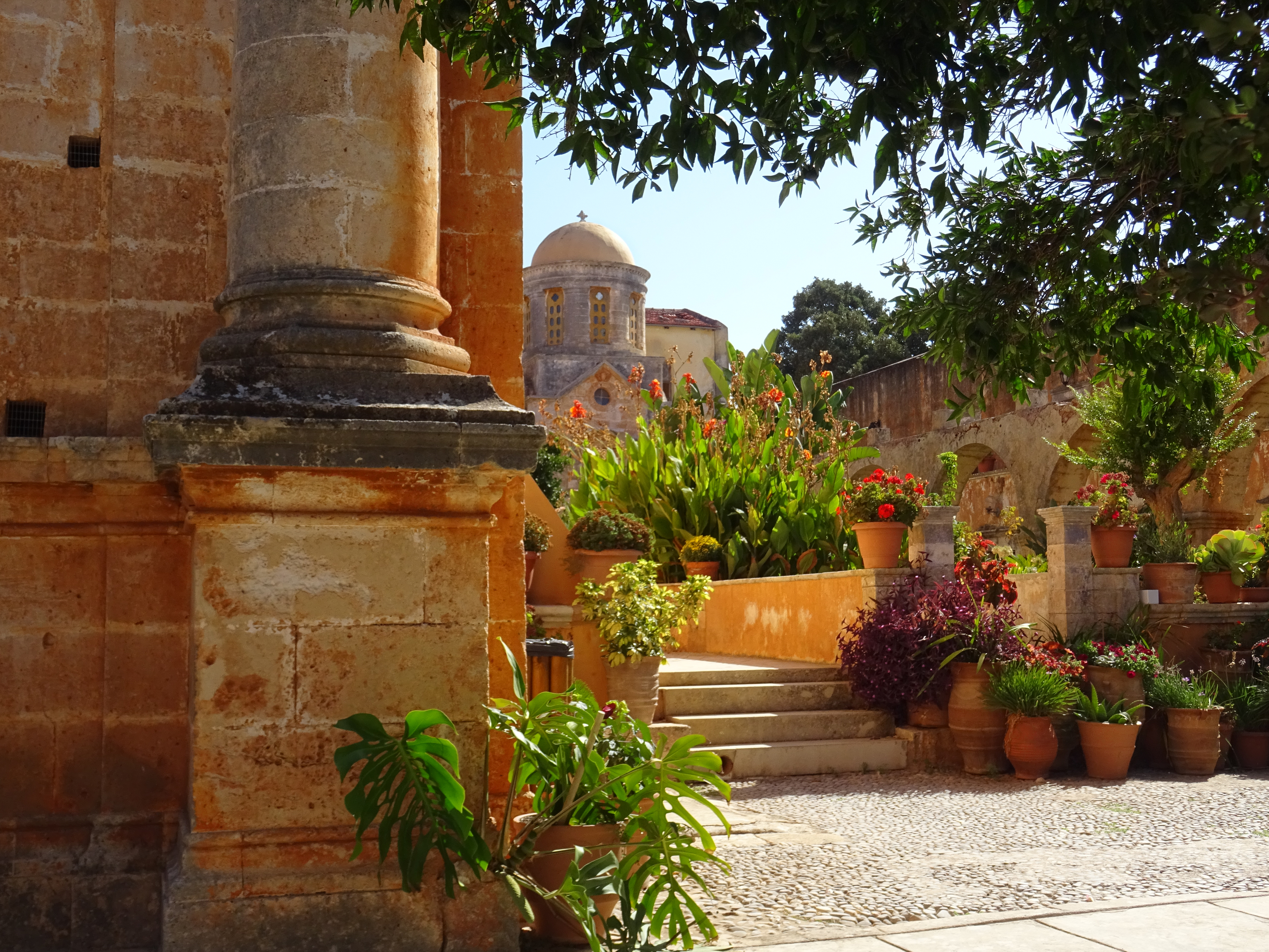 Para muchos turistas, entre los que nos contamos, este pequeño promontorio supone la vía de entrada a Creta, ya que en él se localiza uno de los dos aeropuertos de la isla (el otro está en Heraklion). Es decir, el último lugar donde esperaríamos encontrar pacíficos centros de vida monacal. Pero los hay, no uno, sino dos (monasterios, quiero decir; el tercero que visitaremos está deshabitado y en ruinas). Y no se ven turbados en absoluto por la cercanía de los aviones, o al menos esa es la impresión.